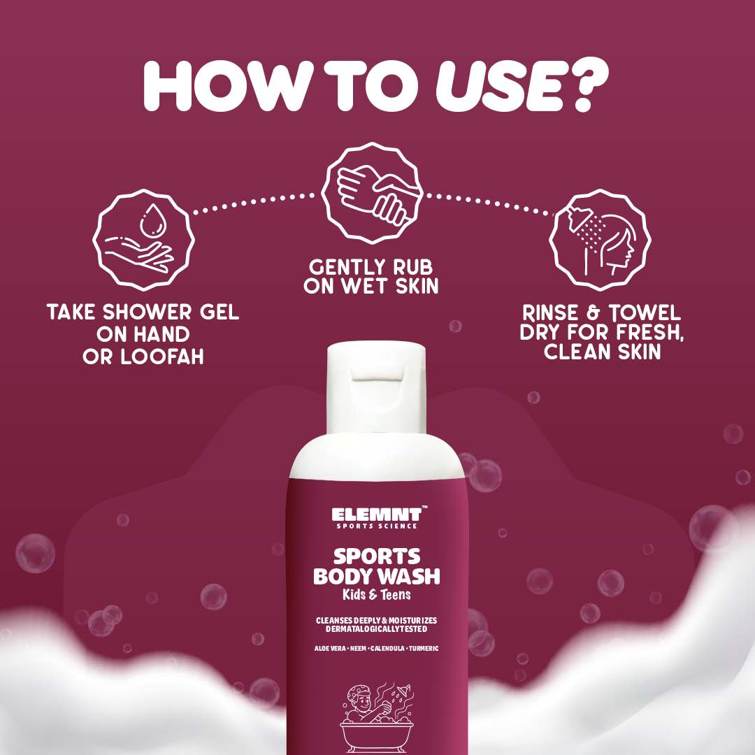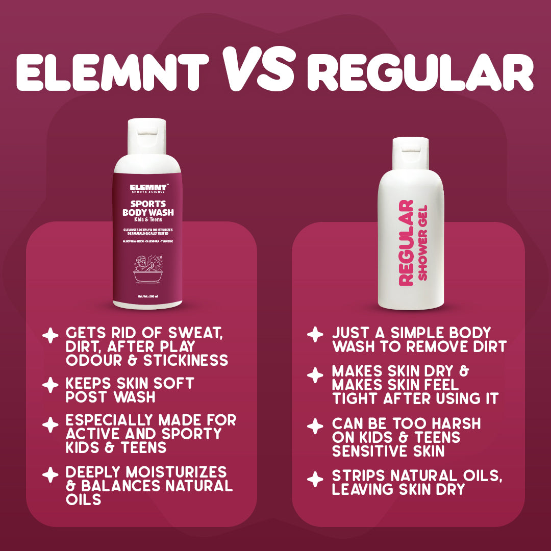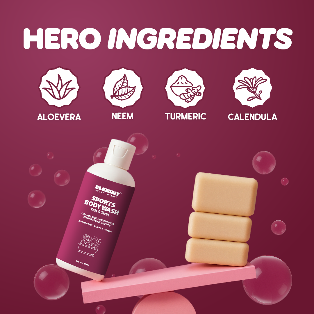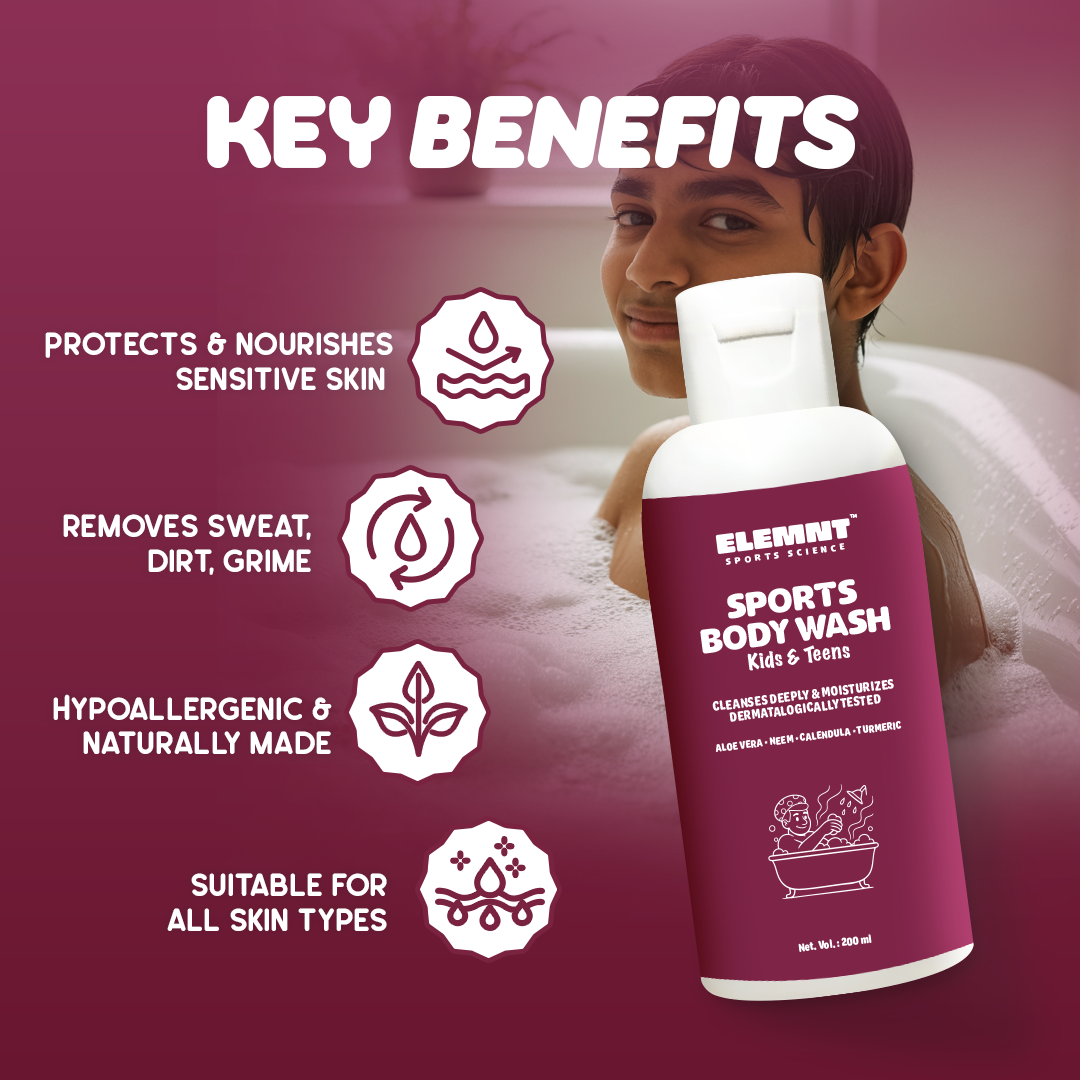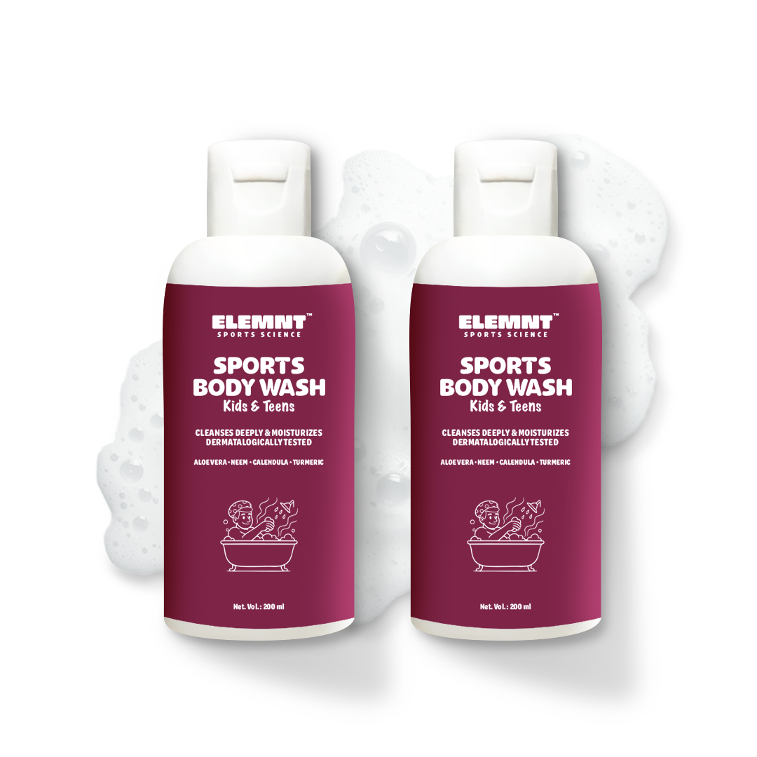 Elemnt's Sports Body Wash is specifically formulated for active children who engage in sports and physical activities. It has enhanced cleansing power to remove sweat, dirt, and sports-related grime while still being gentle. It also contains moisture-restoring ingredients to replenish hydration lost during physical activity, plus natural antibacterial ingredients like Neem and Turmeric.